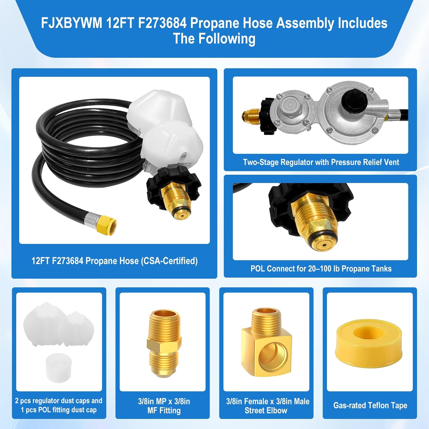 | Included Components | 12FT F273684 Propane Hose, 2-Stage Propane Regulator, 3/8" Propane Adapter, POL Fitting, Propane Hose |